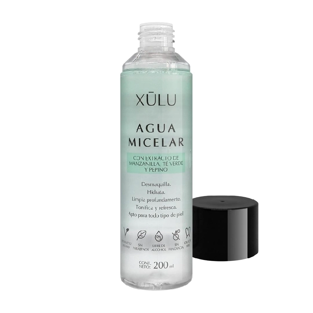 Agua Micelar con extracto de manzanilla, té verde y pepino. Desmaquilla, Hidrata, limpia profundamente, tonifica y refresca. Apta para todo tipo de piel. Vegana. Cruelty free. Sin parabenos. Libre de alcohol. Sin fragancia.