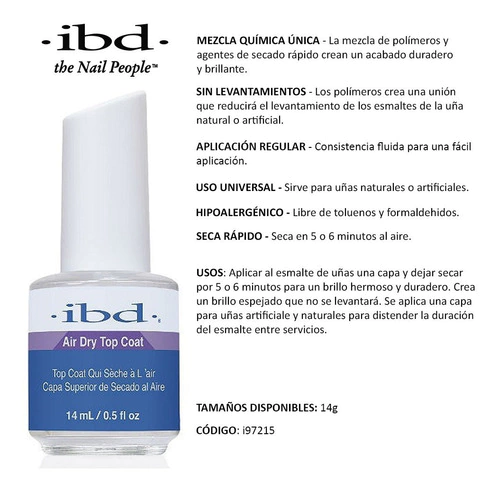 Top coat Air Dry, de la linea profesional Ibd. Acabado perfecto. Consistencia fluida para una facil aplicacion. Sirve para uñas naturales y artificiales. Es hipo alergenico, libre de toluenos y formaldehidos. Se seca en 5/6 minutos al aire. Como se usa correctamente? aplicar una capa de manera uniforme , dejar secar al aire por 5/6 minutos. Este producto garantiza una maxima duracion, proteccion y brillo espejado que no se levantara.