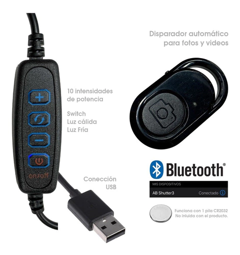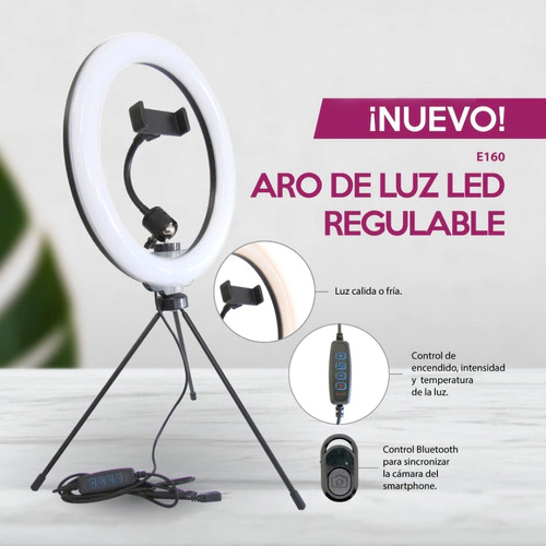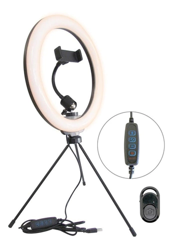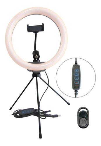 Kit Luz de Anillo 26 cm -Kit Luz de Anillo Led con soporte para celular. Con cable USB y control. -Beneficios: Anillo de Luz viene con tripode y soporte para telefono, el circulo giratorio de 360 grados puede ajustarse libremente a cualquier angulo. Potencia de 10 watts. -Color: Negro. -Medidas: 52 x 26 x 3 cm. - Luces: 60 luces led -Peso: 546 gr.
