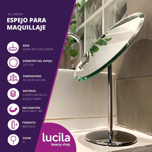 Descripcion del espejo Modelo: E349 Marca: Jessamy Formato: Redondo Aumento: 1X Diametro: 25,5 Cm Altura total: 36 cm Material: Metal Aclaraciones: Espejo ideal para maquillaje, es de pie.