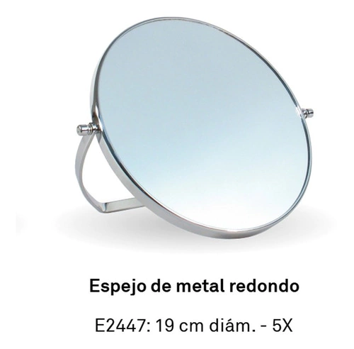 Descripcion del espejo Modelo: E2447 Marca: Jessamy Formato: Redondo Aumento: 5X Diametro: 19 cm Altura total: 15 cm Material: Metal Aclaraciones: Comodo, ideal para maquillarte
