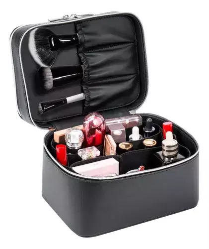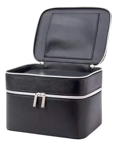 El maletín portacosmético Jessamy combina sofisticación y practicidad en un diseño moderno con doble cierre. Su interior incluye compartimentos desmontables y elásticos porta-brochas que permiten mantener cada producto en su lugar. El acabado en negro con textura elegante lo convierte en un accesorio ideal tanto para el hogar como para viajes. Resistente, espacioso y fácil de transportar gracias a su manija superior.