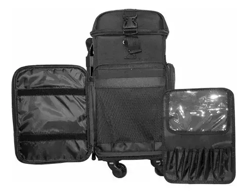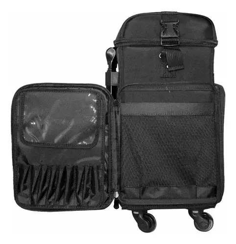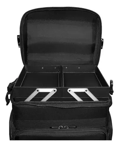 El maletín multiuso premium negro de Jessamy combina practicidad y elegancia en un diseño robusto y funcional. Incorpora compartimentos internos con bolsas transparentes extraíbles y organizadores para mantener todo en orden. Su sistema de bandejas desplegables y múltiples bolsillos facilita el acceso rápido a los accesorios. Además, sus ruedas giratorias y manija extensible lo convierten en el compañero perfecto para viajes o trabajo diario.